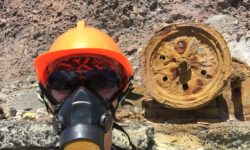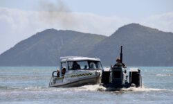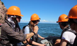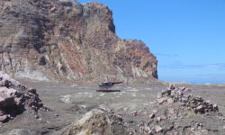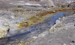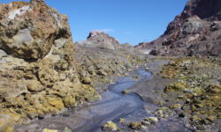 Wir fahren erst einmal eineinhalb Stunden raus zur White Island und werden dann zusammen mit ca. 35 anderen aus aller Herren Länder mit einem Schlauchboot auf die Insel gebracht. Das Schlauchboot fährt ein paar Mal hin und her, bis alle an Land sind. Es sieht aus als wären wir auf dem Mond gelandet. Überall steigt Schwefeldampf aus Ritzen und Löchern. Sofort merken wir wie es in Hals und Nase beißt. Zum Glück bekommen wir Gasmasken und Bonbons zum Lutschen, weil es echt unangenehm ist.