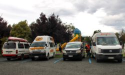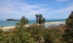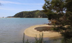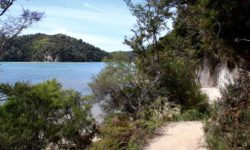 Der Campingplatz in Marahau liegt an einer Bergkette direkt am Meer. Hier beginnt oder endet der Wanderweg durch den Abel Tasman Nationalpark. Wir wollen uns mit einem Wassertaxi an der Torrent Bay absetzen lassen und dann die ca. 15 Kilometer durch den Wald zurück zum Campingplatz laufen. Mit einem Bus geht es vom Campingplatz aus zur Sammelstelle für die Wassertaxis. Dann kommen plötzlich mehrere Trecker auf den Hof gefahren. Im Schlepptau jeweils ein Wassertaxi.