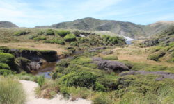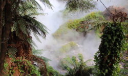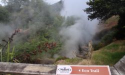 Da wir am näxten Tag noch mehr heiße Quellen besuchen wollen, suche ich einen Campingplatz in der Nähe des Thermal Wonderland aus. Auf dem Campingplatz gibt es sechs verschiedene Becken mit heißem Wasser zum Reinlegen. Herrlich, in 37 bis 40 Grad warmem Wasser kann ich auch bei Regen gut verbringen. Mal sehen, wann der wasserscheue Mann den Weg in die Becken findet. Neben dem Campingplatz führt ein kurzer Trail an einem kochendheißen Bach entlang. Überall steigen Dunstwolken auf und es sieht irgendwie mystisch aus.