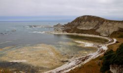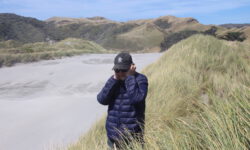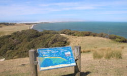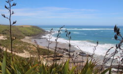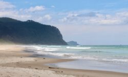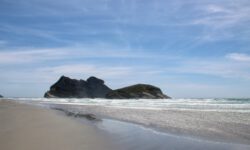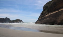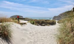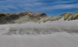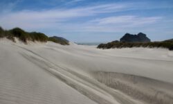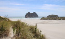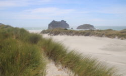 Am empfohlenen Café mit den heimischen Backwaren in Takaka, einem ziemlich hippen Ort, lassen wir uns eine Nussecke und ein Schweineohr schmecken. Kia ora, Dirk! Wir fahren weiter durch die Berge und an der Küste entlang bis zum nördlichsten Zipfel der Südinsel, dem Cape Farewell. Wir vermuten, dass es so heißt, weil man schnell wieder weg möchte. Es ist tierisch windig, Jazon L. wackelt sich durch die, zugegeben sehr schöne, Landschaft. Am Wharanaki Beach ist der Wind so heftig, dass einige Leute zurückgehen, weil unentwegt Sand durch die Gegend wirbelt. Stimmt, es ist quasi ein Wüstensturm direkt am Meer.