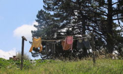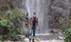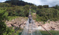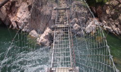 Vor uns steht ein Wagen aus der DDR. Der hat auf der Bergabstrecke heiße Bremsen bekommen. Wir lassen die Fenster lieber zu. Auf der Heckklappe steht Odyssee und die Leute, die aussteigen, sehen auch abenteuerlich aus. Ich nutze die Wartezeit für einen kleinen Spaziergang zur Sondierung der Lage. Angekommen am abgesperrten Bereich kann ich über die Absperrung sehen und wage nicht weiter zu gehen. Hui, das sieht nicht sehr vertrauenserweckend aus. Unten angekommen freuen wir uns über Apfel- und Pfirsichplantagen, einen weiteren Schuhzaun, eine Wackelbrücke unter den Füßen und festen Boden unter den Reifen.