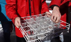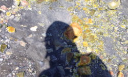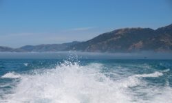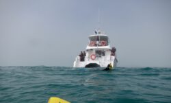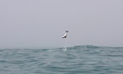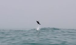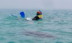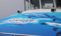 Wir fahren im Nebel los und der Käpt’n findet tatsächlich nach kurzer Zeit ein paar Delfine. Er bläst ins Horn und alle Schwimmer gehen ins Wasser. Wir singen, rufen, tauchen runter, wedeln wild mit den Flossen, aber die vier bis fünf Delfine haben keine Lust mit uns zu schwimmen. Sie sind schnell wieder weg und wir schwimmen zurück zum Boot. Weiter geht die Suche nach dem Delfinschwarm mit Lust auf Tummeln mit Touris.