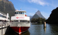 Auf der Bootstour durch den Sound können wir die tolle Landschaft von der Wasserseite aus sehen. Wir haben einen der, eher seltenen, Sonnentage erwischt. An einem Wasserfall, unter dem wir stehen bleiben, wird eine Ladung Gläser gefüllt und an Bord verteilt: „The King of table waters“. Auf der Rückfahrt halten wir an einem Unterwasserobservatorium an und können zehn Meter unter Wasser Fische, Korallen und andere Meeresbewohner beobachten.