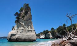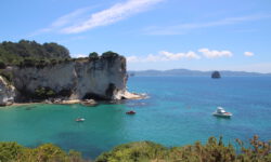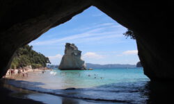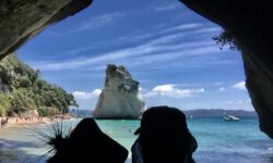 Es geht weiter in den Norden der Coromandel. Dort wandern wir zu einem, nur über einen mehr als halbstündigen recht anspruchsvollen Auf- und Ab-Fußweg erreichbaren, Strand an einer Höhle. Cathedral Cove nennt sich dieser versteckte, wenn auch bekannte Ort. Wow, diese Wasserfarbe, die Höhle, von der man nun weiß, warum sie diesen Namen trägt, der Fels im Wasser und der Strand sehen wirklich toll aus. Wir bleiben eine Zeit lang auf ein paar Steinen sitzen und sehen aufs Wasser.