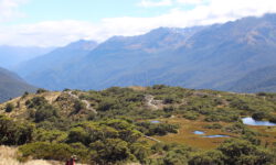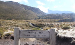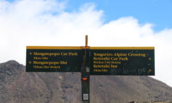 Es geht wieder weiter nach oben zum größeren Blue Lake und danach fast nur noch bergab zum Parkplatz. Wir haben das Gefühl, dass wir schon gleich da sind auch wenn ein Schild behauptet es seien noch zweieinhalb Stunden. Und dann kommt der Teil der Strecke, der niemals zu enden scheint. Wir mäandern über die Berge in schier endlosen Serpentinen. Von hoch oben können wir schon die Straße zum Parkplatz erkennen. Dann kommt eine kleine frustrierende Brücke, an der hängt ein Schild: 14km. Oh je, noch 5,4 Kilometer. Unsere Zehen drücken permanent vorne gegen die Schuhe und wir wünschen uns ein paar Steigungen oder zumindest Ebenen zwischendurch. Die gibt es hier nicht. Es geht immer nur bergab.