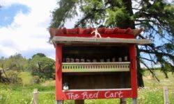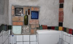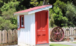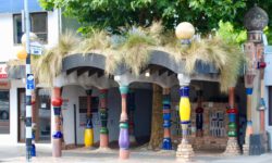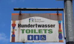 Der nächste Stop ist eine kurze Pinkelpause. Es gibt hier ja genügend Bäume und Büsche, so dass wir immer schnell was finden. Diesmal warten wir aber ein bisschen ab und fahren bis nach Kawakawa. In diesem Ort hat Friedensreich Hundertwasser 25 Jahre lang bis zu seinem Tod gelebt. Sein einziges Projekt während dieser Zeit war eine öffentliche Toilette in diesem verschlafenen Nest. Gut für uns. Erleichtert fahren wir weiter!