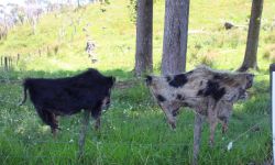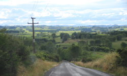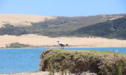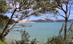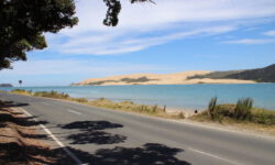 Es geht rüber zur Westküste. Cape Reinga, die nördlichste Spitze Neuseelands lassen wir aus, da dort nicht allzu viel zu sehen ist und wir uns für den nächsten Tag in der Coromandel verabredet haben. Die Strecke Richtung Westen ist klasse, wir halten immer wieder an und machen Fotos von Sanddünen, Seen, Meeresarmen und der grünen Landschaft. Manchmal erinnert uns die Landschaft stark ans Sauerland oder an die Eifel. Und es gibt einsame Streckenabschnitte, da möchte wirklich kein Schwein tot überm Zaun hängen. Dann sehen wir aber wieder das Meer und wissen. dass wir doch woanders sind.