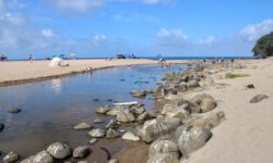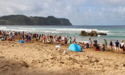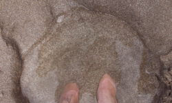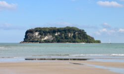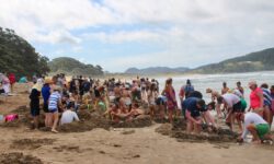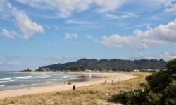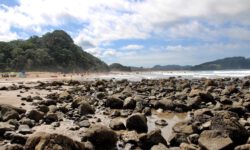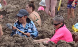 Wir fahren zum Hot Water Beach ganz in der Nähe. Dieser Strand liegt direkt über vulkanisch aktivem Gebiet. In zwei Kilometern Tiefe befinden sich heißes Quellwasser und heiße Steine. Bei Ebbe wird ein Bereich des Strandes freigegeben, an dem diese Quellen heißes Wasser nach oben drücken und der Sand ganz heiß wird. Zwei Stunden vor und nach Ebbe kann man ein besonderes Schauspiel beobachten. Erwachsene wie Kinder begeben sich zu diesen Stellen am Strand und buddeln mit Schaufeln tiefe Löcher in den Sand, die sich dann mit dem heißen Wasser füllen. Anschließend oder auch während des Buddelns sitzen sie in ihren Löchern im ziemlich warmen Wasser.