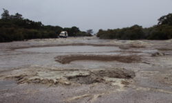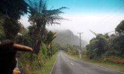 Nach einem Tipp von Dirk, einem ehemaligen Kollegen von Klaus, fahren wir weiter Richtung Norden. Die Straße fährt sich ziemlich abenteuerlich. Einige Kurven wurden durch Kunststoffabsperrungen „gesichert“, weil durch Erdrutsche ein Teil der Fahrbahn weggebrochen ist. Ich sitze auf der linken Seite, schön nah dran am Abgrund und hoffe, dass nicht ausgerechnet in diesem Moment weitere Teile der Straße verschwinden. Morgen wäre es aber genauso blöd, da diese Straße auch der einzige Rückweg ist.