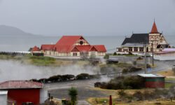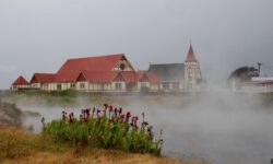 Rotorua ist bekannt für Maori-Kultur, heiße Quellen und Schlammlöcher. Das Wetter hier ist eher schottisch nass. Shane hat uns ja schon gesagt, dass der Regen kommen wird und wir ausgesprochen viel Glück hatten, in den ersten zwei Neuseelandwochen keinen Regen abbekommen zu haben. Wir sehen uns erst einmal die Stadt an, das geht auch ganz gut bei Regen. In der Innenstadt gibt es die üblichen Läden, aber nicht weit vom Zentrum entfernt, beginnt es interessant zu werden. Es sieht aus, als wären wir schon wieder auf einem Filmset.