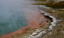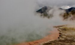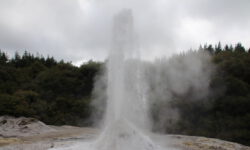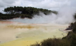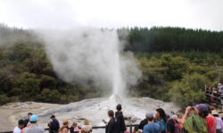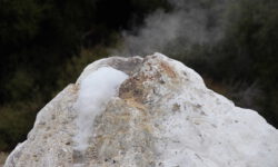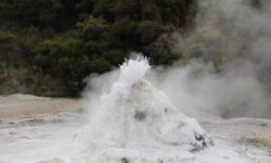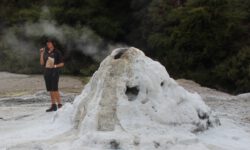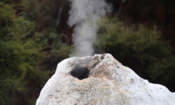 Das Thermal Wonderland trägt seinen Namen zurecht. Als erstes besuchen wir den Lady Knox-Geysir. Dieser wird täglich um 10:15 Uhr mit Seife „gefüttert“ und speit dann nach ein paar Minuten zwischen zehn und zwanzig Meter hohe Wasserfontänen für mindestens eine Stunde. Dieses Phänomem haben Gefangene in einem Straflager vor mehr als hundert Jahren entdeckt, als sie in dieser Gegend ihre Wäsche wuschen.