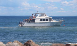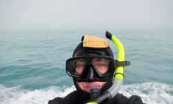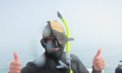 Dann ein kleiner Schock am Morgen als es losgehen soll. Es ist useliges Nebelwetter. Waaaas? Das hat niemand vorausgesagt. Ich bin sicher, dass die Bootsfahrt abgesagt wird, fahre aber trotzdem erst einmal zum vereinbarten Treffpunkt. Dort ist man trotz des Nebels recht zuversichtlich und die Fahrt wird keineswegs abgesagt. Nach ein paar Sicherheitseinweisungen bekomme ich meinen Neoprenburkini und ein paar Flossen und es geht mit ca. 25 anderen aufs Boot. Klaus bekommt frei und freut sich, dass er das Geld für solch einen Unsinn sparen kann.
