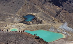 Dann geht es zum schönsten, aber auch zum gefährlichsten Abschnitt des Weges. Von oben sehen wir schon die grünlich und bläulich schimmernden Emerald Lakes und weiter hinten den Blue Lake. Dann geht es runter. Über eine lange steile Schotterpiste, auf der man immer wieder wegrutscht. Links und rechts der Piste geht es ebenfalls steil bergab. Ein Sturz wäre fatal. Kein Geländer, kein Seil, keine Kette. Nichts. Jeder hat eine andere Taktik den Abhang lebend zu überwinden. Erstaunlicherweise passiert offenbar sehr wenig, wir können uns sonst nicht vorstellen, warum keinerlei Sicherungen, eventuell auch für weniger bewegliche Wanderer, eingebaut wurden. Geschafft, ich freue mich über die wunderbaren Fotomotive an den Seen.