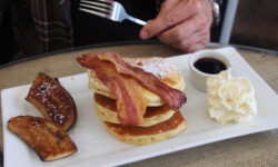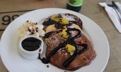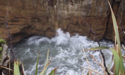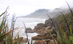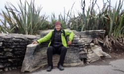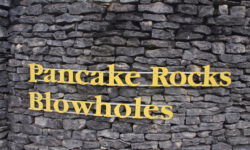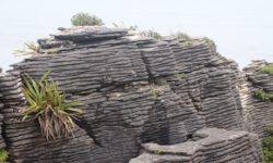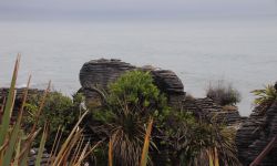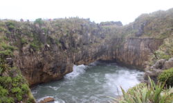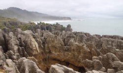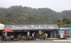 Wir fahren zu den Pancake Rocks im Paparoa Nationalpark, einer seltsamen Steinformation im Meer. Kurz vorher ändert sich die Vegetation enorm, dazu kommt etwas Nebel und es sieht aus wie in Jurassic Park. Über einen angelegten Weg kommen wir den Felsen sehr nahe. Auf der Straße gegenüber liegt das Pancake Rocks Café. Irgendwie ist uns den ganzen Tag schon nach Pfannekuchen … 🙂