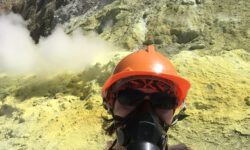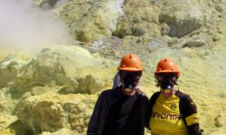 Dann wandern wir mit zwei Guides durch diese seltsame Landschaft. Wenn es nicht so gelb wäre sondern rötlich, dann würde man denken, dass man auf dem Mars spaziert. Bis Anfang des 20. Jahrhunderts wurde hier in einer Mine Schwefel abgebaut. Die Minenreste liegen in dieser bizarren Landschaft noch herum. Wir wandern eineinhalb Stunden durch das Innere des Kraters bis zu einem See, der gelb-grünliches Wasser enthält. Heute ist diese Farbe aber kaum zu erkennen, da zu viele Nebelschwaden darüber wabern.