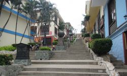Die Kathedrale befindet sich direkt neben dem Park. Wir gehen hinein und dann rüber zum Malecon. Diese Promenade ist einige Kilometer lang und führt am Fluss Guayas entlang. Hier findet man Skulpturen, Cafés, Kinderspielplätze, Aussichtsterassen und Killefitstände. Am nördlichen Ende der Malecon befindet sich der Hügel Santa Ana. Vierhundertvierundvierzig Stufen führen bis ganz nach oben, alle fein säuberlich durchnummeriert, zum Leuchtturm und zur Kapelle. Die Häuser am Hügel sind schön bunt und man hat eine Rundumsicht auf die Stadt, den Fluss und die Malecon.