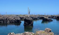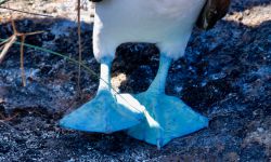 Dort machen wir einen Landgang und sehen einen kleinen Seelöwen und einige Meeresschildkröten im Wasser, das hier sehr klar ist. Auf dem Land finden wir einige Blaufußtölpel, die nicht zufällig so heißen. Sie haben tatsächlich blaue Füße, weil sie sich von bestimmten Fischen ernähren, die diese Farbe bei ihnen hinterlassen. Und da ihre großen Füße beim Laufen ständig im Weg sind, gehen sie wie ein Tölpel durch die Landschaft. Beim Fliegen sind sie allerdings meisterlich unterwegs und schießen aus der Luft bis zu zehn Meter und mehr unter die Wasseroberfläche, um dort einen Fisch direkt zu verschlucken.