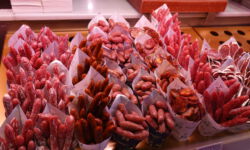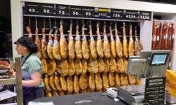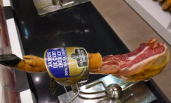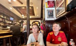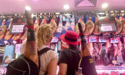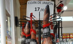 Nach dem großen Staunen brauchen wir erst einmal eine Pause und wir schlendern noch einmal zum Mercado San Miguel. Auf dem Weg dahin sehen wir in einem Touriladen Schinken hängen. Die sehen total echt aus, sind aber Kissen. Britta und ich können nicht anders und kaufen uns diese schönen Ibericoschinken. Wir stecken sie in unseren Ruxsack. Aber sie passen nicht ganz rein, daher gucken sie oben raus. Damit haben wir die Show im Kasten. Andauernd sehen Leute auf die schönen Schinken und fangen an zu grinsen oder zu lachen. Zwei Frauen möchten auch unbedingt welche haben und fragen uns, woher wir sie haben. Wir verraten ihnen natürlich wo sie diesen Laden finden und die Freude ist groß.