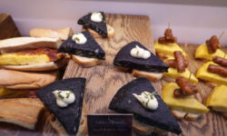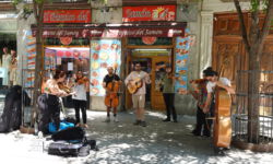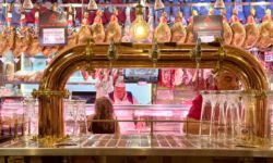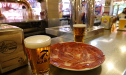 Wir gehen weiter in die Markthalle und essen uns durch verschiedene Tapashäppchen. Die sind soooooo gut, wir lieben alle diese spanische Häppchen. Dazu gibt es Weißwein und Sangria, das passt. Nun wollen wir in die bekannteste Chocolateria/ Churreria Madrids: San Ginés. Auf dem Weg dahin finden wir ein Schinkenmuseum, das ein Angebot an der Scheibe kleben hat: Zwei Bier und eine Platte mit Schinken für 5 Euro. Das klingt aber gut, also probieren wir das mal aus. Es schmeckt und wir werden wieder auf unsere Schinken angesprochen.