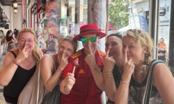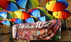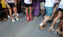 Dann geht es endlich zum Stöckelschuhrennen. Die Stöckel müssen mindestens 15 cm hoch sein und die Teilnehmer müssen am Schluss eine Handtasche schnappen und beim Zurücklaufen Lippenstift auftragen. Der Gewinner bekommt 350 Euro! Britta und ich gehen schon mal vor, weil wir unbedingt einen guten Platz in der ersten Reihe ergattern wollen, damit wir schöne Fotos machen können. Das gelingt uns zum Glück auch, wir stehen direkt am Ziel und sehen die Läufer, die Journalisten sowie einen Kameramann vom Fernsehen. Kurz vor dem Rennen laufen einige Transvestiten durch die enge Gasse und lassen sich von den Zuschauern fotografieren. Es ist ein buntes Treiben und die Zuschauer sehen ebenso bunt aus. Britta und ich werfen uns dafür natürlich auch in passende Schale.