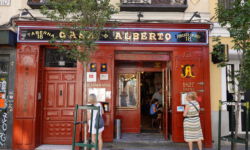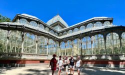 Dann geht es zu Madrids Westfalenpark, den El Retiro. Wir spazieren durch eine Zypressenallee bis zum See und anschließend zum Kristallpalast, der ganz aus Glas gebaut ist und manchmal Ausstellungen beherbergt. Heute ist er aber ganz leer. Im Park befinden sich viele Statuen von Alfonso XII, der im 19. Jahrhundert König von Spanien war. Wir gehen einmal quer durch den Park und genießen die Ruhe und den Schatten, bevor es uns wieder in den Städtetrubel zieht. Wir gehen vorbei am CaixaForum, einem Kulturzentrum, das von der Stiftung „la Caixa“ verwaltet wird und als Museum und Konferenzzentrum dient. Eine Hausseite ist komplett mit hängenden Pflanzen versehen. Dann landen wir zufällig in der ältesten Tapasbar Madrids, der Casa Alberto. Das Ambiente ist urig wie noch vor hundert Jahren und die Tapas besonders gut.