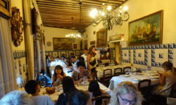 In der Churreria sitzen wir in einem traditionellen, gekachelten Raum mit vielen Fotos an der Wand, von denen wir vermuten, dass es sich um berühmte Gäste aus alten Zeiten handelt. Seit 1894 gibt es hier viele verschiedene Kaffeesorten und die berühmten Churros, die aus Krapfenteig hergestellt und in Wurstform fritiert werden. Dazu gibt es eine Tasse warme Schokolade, in die man die Churros vor dem Verzehr taucht. Mmmmmhhh!